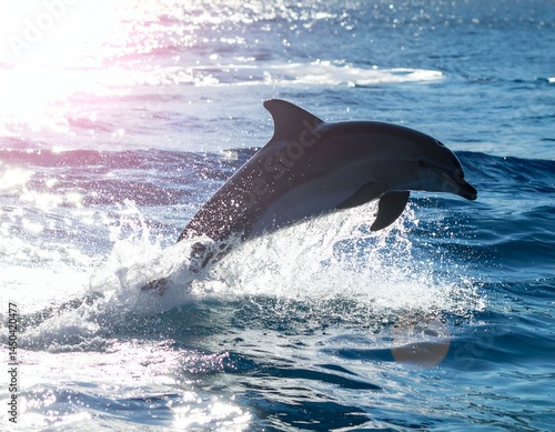 Fototapeta premium Dolphin leaping from ocean water, backlit by sun, creating sparkling water...