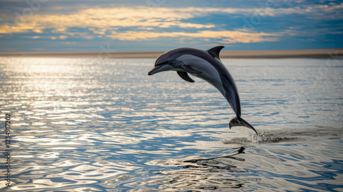 Obraz premium Dolphin leaping from the ocean at sunset.