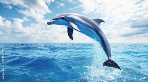 © azi, Fototapeta premium Dolphin leaping high above ocean waves under a bright blue sky.