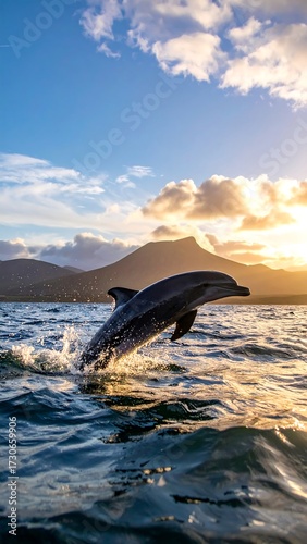 © Aku, Obraz premium Dolphin Leaping in Ocean Sunrise.