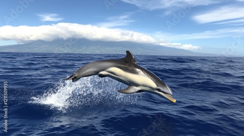 © Siti, Fototapeta premium Dolphin Leaping in the Ocean with Mountain Background