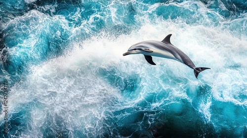 © Windi, Obraz premium Dolphin leaping ocean waves aerial view travel poster