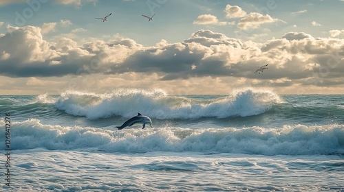 Fototapeta premium Dolphin leaping over ocean waves at sunset.