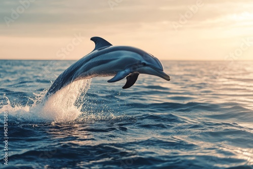 © AHNH3, Fototapeta premium Dolphin Leaping Through the Waves at Sunset