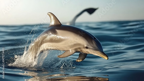 © ปฏิภาน ผดุงรัตน์, Fototapeta premium Dolphin Leaping Through Waves in Clear Sunny Ocean Water
