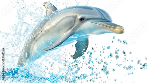 Fototapeta premium dolphin leaps gracefully out of ocean, surrounded by splashes of water, showcasing its playful nature and agility. This vibrant scene captures essence of marine life