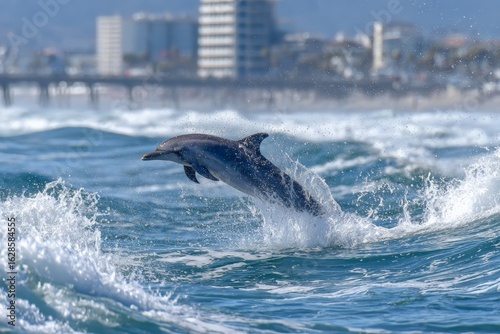 Naklejka premium Dolphin leaps through ocean waves against coastal backdrop in sunny weather...