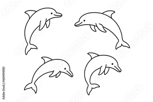 Naklejka premium Dolphin line art vector set. Cute cartoon marine animal characters. Playful ocean wildlife icon collection. Simple minimalist outline graphic illustration for logo design.