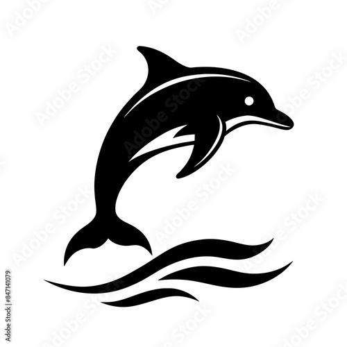 © Chayon Sarker, Naklejka premium Dolphin over a wave engraving vector silhouette an white background