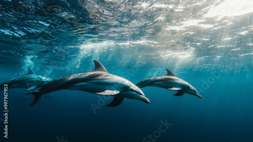 Fototapeta premium Dolphin Pod Swimming Together in Harmony Underneath the Blue Waves