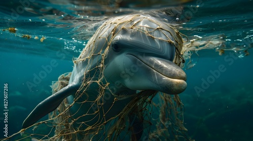 Obraz premium Dolphin's Fight for Freedom: A Struggle Against Discarded Fishing Nets