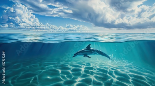 © wicha, Fototapeta premium dolphin's reflection glimmers on the calm ocean surface as it swims just beneath the waves.