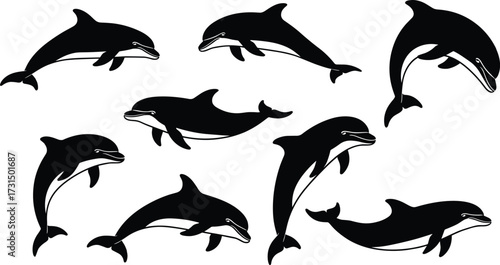 Naklejka premium Dolphin silhouette vector illustration, jumping dolphin artwork, marine animal design, ocean wildlife drawing, aquatic mammal collection, sea dolphin outline illustration