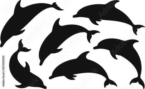 © Silhouette designer, Naklejka premium Dolphin silhouette vector set, collection of dolphin swimming and jumping pose icon in black isolated style