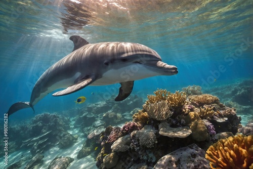 Fototapeta premium Dolphin Swimming Alongside a Coral Reef in Clear Tropical Waters
