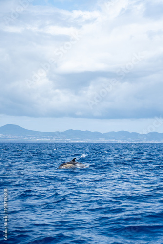 Obraz premium Dolphin swimming in ocean waters near the scenic mountainous coastline