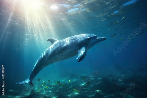 © Nilla, Obraz premium Dolphin swimming in the ocean with sun light flare from the surface. Nature underwater animal wildlife concept.