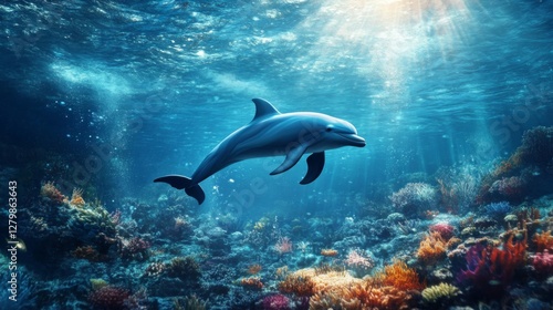 Fototapeta premium Dolphin Swimming in Vibrant Coral Reef Underwater