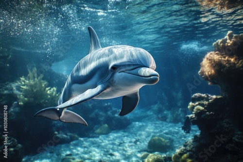 © Alexandr, Fototapeta premium Dolphin swimming near coral reef