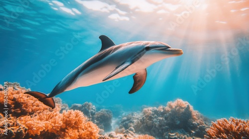 Obraz premium Dolphin Swimming Near Coral Reef at Sunrise