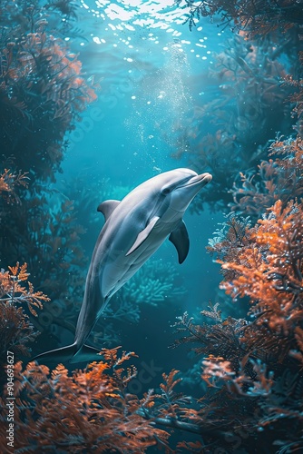 Fototapeta premium Dolphin Swimming Through a Sunlit Coral Reef
