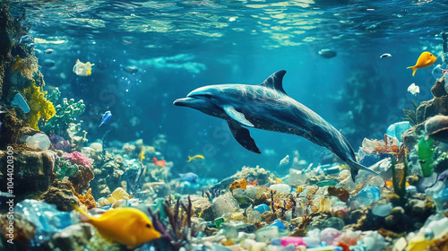 Fototapeta premium Dolphin swimming through vibrant coral reef overwhelmed by plastic pollution in a marine habitat