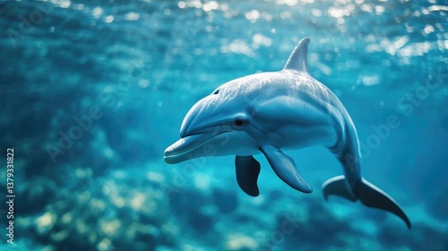 Fototapeta premium Dolphin Swimming Underwater in Blue Ocean Sunlight Marine Life Image