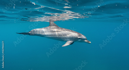 © Vanier Johanne, Fototapeta premium Dolphin Swimming Underwater in Clear Blue Ocean Water