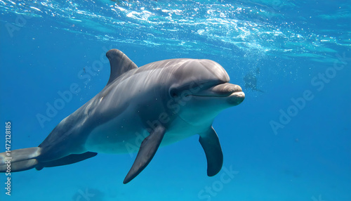 Fototapeta premium Dolphin swimming underwater in clear blue ocean water marine wildlife