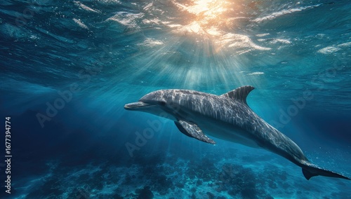 Fototapeta premium Dolphin swimming underwater, sunbeams (2)