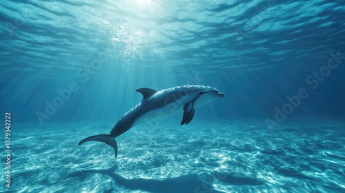 Fototapeta premium Dolphin Swimming Underwater with Sun Rays in Ocean Environment Scenery