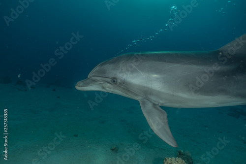 Naklejka premium Dolphin swimming with divers in the Red Sea, Eilat Israel