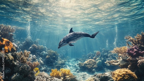 © Lilly, Obraz premium Dolphin underwater on reef approaching