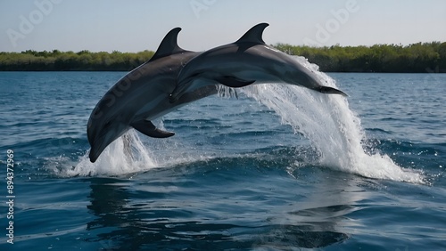 © Oleksandr, Fototapeta premium Dolphins creating beautiful patterns as they leap through the surf