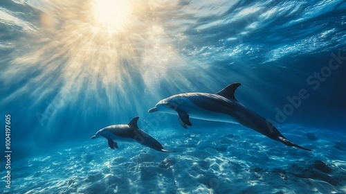 © Arabindu, Obraz premium Dolphins harmoniously swimming in idyllic clear ocean setting