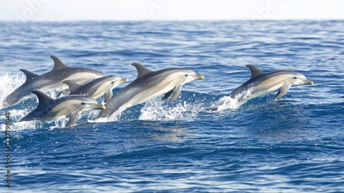 Fototapeta premium Dolphins Joyfully Leaping Over Sparkling Ocean Waves in Open Water