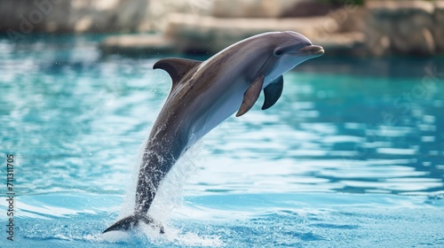 Fototapeta premium Dolphins jumping in a pool with clear blue water at an animal theme park.