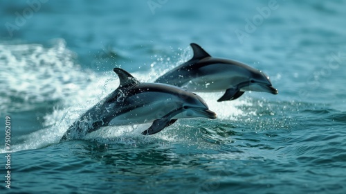 Fototapeta premium Dolphins jumping in ocean waters. Aquatic Sealife. Ocean. Endangered....