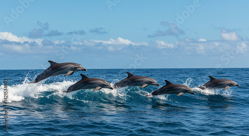© Vanier Johanne, Fototapeta premium Dolphins Jumping Out of Water in the Open Ocean