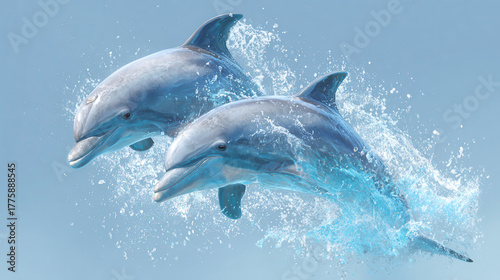 © vasyl pshyk, Fototapeta premium Dolphins leap gracefully above ocean surface during a sunny day at sea