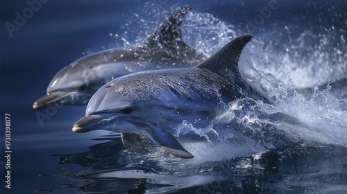 © Iarte, Fototapeta premium Dolphins leap joyfully over calm ocean waters during a sunny afternoon near the coast