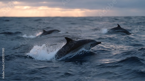 Fototapeta premium Dolphins leaping and splashing in the ocean at dawn with golden light breaking through clouds