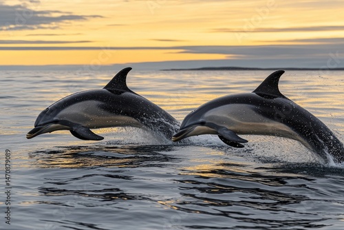 © Nur, Fototapeta premium Dolphins leaping at sunset (1)