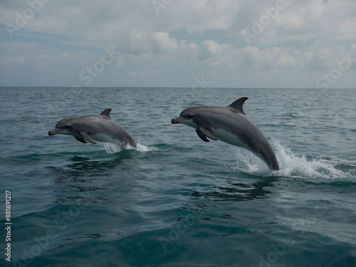 Fototapeta premium Dolphins Leaping Over Ocean Waves at Sunset