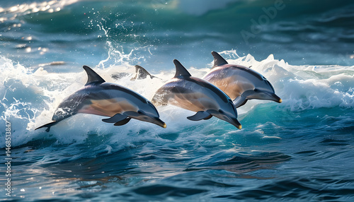 Fototapeta premium Dolphins leaping over waves ocean wildlife photography marine environment...
