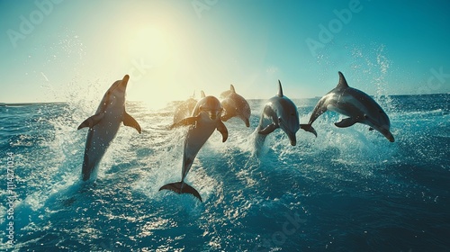 Obraz premium Dolphins leaping playfully in ocean sunlight