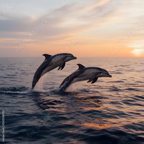 Obraz premium Dolphins leaping sunset ocean wildlife nature travel