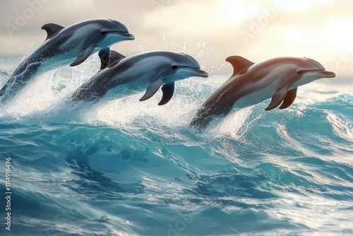 Naklejka premium Dolphins Leaping Through Turquoise Waves Beautiful Aquatic Art Bottlenose...