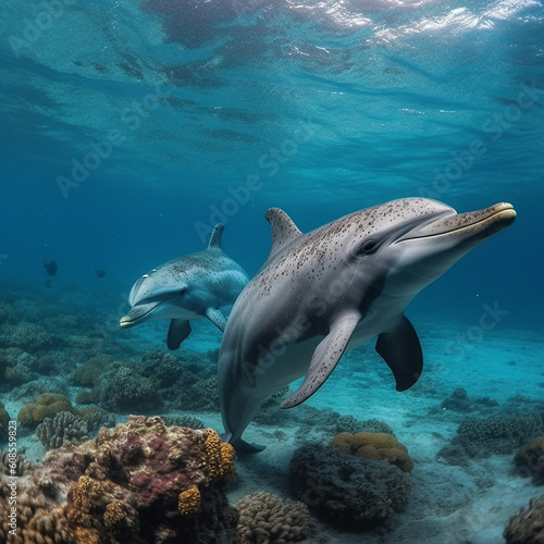 © D-stock photo, Fototapeta premium Dolphins on the coral reef at Maldives. Dolphins swimming in the ocean.