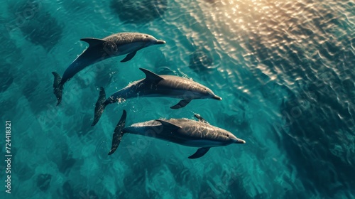 Fototapeta premium Dolphins swim gracefully through turquoise waters